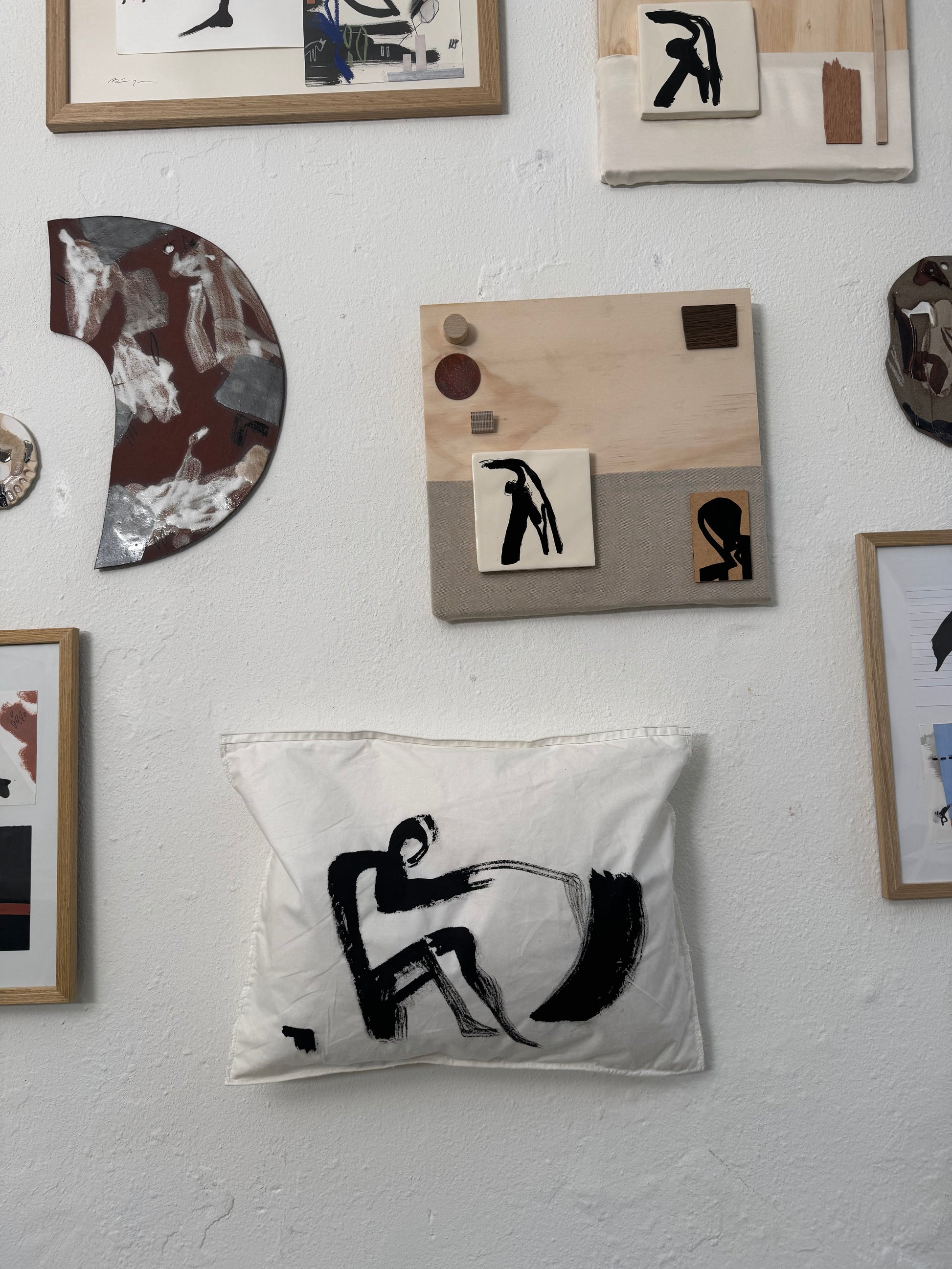 The artwork balances softness and structure: the gentle presence of feathers and fabric meets the intentional marks of paint and stitched lines. Every thread and brushstroke is placed by hand, allowing the materials to guide the final expression.